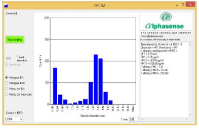 OPC-N2的電子裝置通過SPI接口結(jié)合軟件應(yīng)用,可直接在電腦或安卓手機(jī)上直觀地顯示各種尺寸微顆粒物的數(shù)量及分布,使用非常簡便。