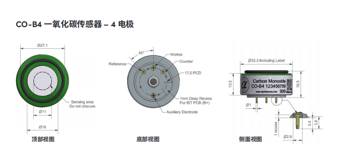 二、英國alphasense 高分辨率一氧化碳傳感器(CO傳感器)CO-B4 CO-B4+ 特性: