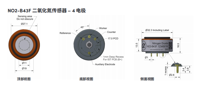 一、二氧化氮傳感器(NO2傳感器)4電極 NO2-B43F NO2-B43F+ 描述: