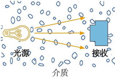 傳感器上發(fā)射器發(fā)送的光波在傳輸過(guò)程中經(jīng)過(guò)被測(cè)物的吸收、反射和散射后,有一部分透射光線能照射到 180°方向的檢測(cè)器上,有一部分散射光散射到