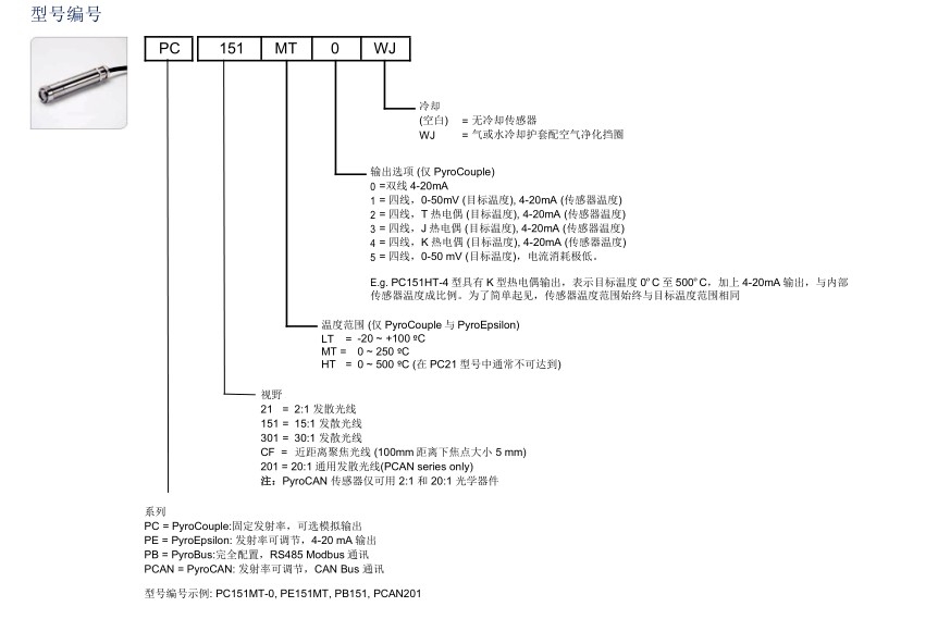 三、英國Calex Electronics Ltd 紅外溫度傳感器 PyroCouple,PyroEpsilon,PyroBus, PyroCAN產(chǎn)品選型: