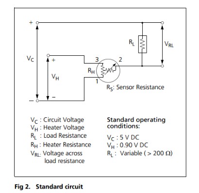 Fig2展示了此產(chǎn)品的標準使用電路。傳感器阻值(Rs)的變化導(dǎo)致了負載電阻(RL)上的電壓的變化。為了獲取最佳的性能和參數(shù),加熱電壓(VH),電路電壓(Vc)和負載電阻(RL)的值必須在給定的標準操作條件下的值,具體參數(shù)表在下一頁表述。
