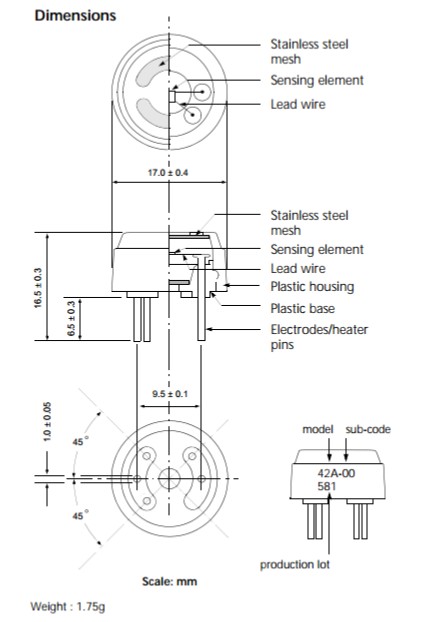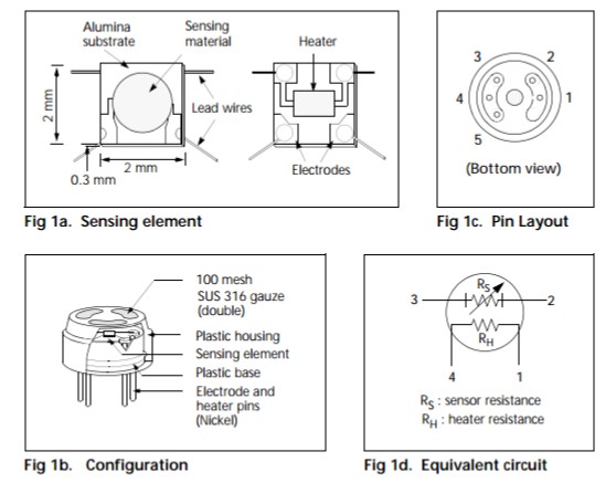 氣體感應(yīng)半導(dǎo)體材料緊貼在鋁基片上,金電極打印在基片上。氧化釕的薄加熱器打印在基片的背面,并且放在塑料封裝中(Fig1)。