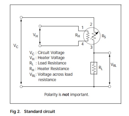 Fig2展示了此產(chǎn)品的標(biāo)準(zhǔn)使用電路。傳感器阻值(Rs)的變化導(dǎo)致了負(fù)載電阻(RL)上的電壓的變化。為了獲取最佳的性能和參數(shù),加熱電壓(VH),電路電壓(Vc)和負(fù)載電阻(RL)的值必須在給定的標(biāo)準(zhǔn)操作條件下的值,具體參數(shù)表在下一頁表述。