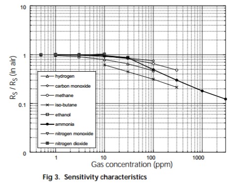 Fig3展示了SP-53A(典型數(shù)據(jù))的靈敏度參數(shù)曲線。氣體傳感器的靈敏度參數(shù)是傳感器阻值和氣體濃度的關(guān)系的體現(xiàn)?;趯?duì)數(shù)功能,傳感器阻值的減小,被測(cè)氣體濃度隨之增加。SP-53A的靈敏度參數(shù)由以下的參數(shù)詳細(xì)說(shuō)明。