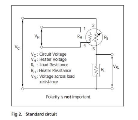 Fig2展示了此產(chǎn)品的標(biāo)準(zhǔn)使用電路。傳感器阻值(Rs)的變化導(dǎo)致了負(fù)載電阻(RL)上的電壓的變化。為了獲取最佳的性能和參數(shù),加熱電壓(VH),電路電壓(Vc)和負(fù)載電阻(RL)的值必須在給定的標(biāo)準(zhǔn)操作條件下的值,具體參數(shù)表在下一頁(yè)表述。