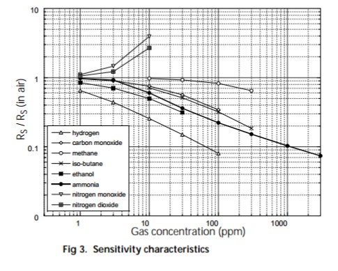 Fig3展示了SP-53B(典型數(shù)據(jù))的靈敏度參數(shù)曲線。氣體傳感器的靈敏度參數(shù)是傳感器阻值和氣體濃度的關(guān)系的體現(xiàn)?;趯?duì)數(shù)功能,傳感器阻值的減小,被測(cè)氣體濃度隨之增加。SP-53B的靈敏度參數(shù)由以下的參數(shù)詳細(xì)說(shuō)明。