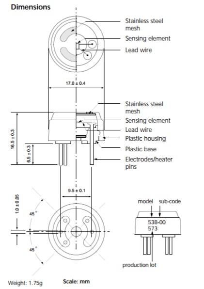 氣體感應(yīng)半導(dǎo)體材料緊貼在鋁基片上,金電極打印在基片上。氧化釕的薄加熱器打印在基片的背面,并且放在塑料封裝中(Fig1)。