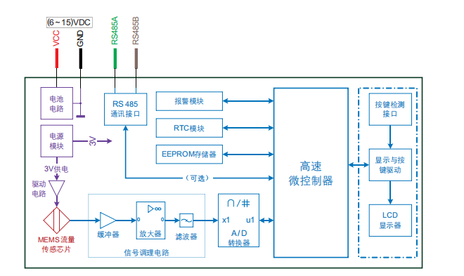 該流量計(jì)同時(shí)實(shí)現(xiàn)熱源的產(chǎn)生與溫度的測量。當(dāng)芯片處于工作狀態(tài)時(shí),在傳感器的周邊形成穩(wěn)定的溫度場分布。一旦一定質(zhì)量的氣體流過傳感器時(shí),氣體的流動(dòng)將破壞該溫度場的分布,形成特定的、取決于該氣體的質(zhì)量和速度的溫度場分布。微機(jī)電系統(tǒng)流量計(jì)芯片上的傳感器將測量這一變化并把這一變化轉(zhuǎn)換為電信號,由一個(gè)專門的電路變送器對此信號進(jìn)行放大、調(diào)理并作線性化處理。由于不同質(zhì)量的氣體對傳感器的周邊形成穩(wěn)定的溫度場分布所產(chǎn)生的擾動(dòng)不同,因而能測量氣體的質(zhì)量流量或總流量。下圖為該系列流量計(jì)的原理框圖。