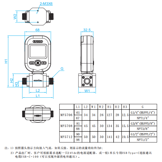 五、美國SiargoMF5700系列便攜式氣體質(zhì)量流量計(jì) 產(chǎn)品結(jié)構(gòu)與機(jī)械尺寸: