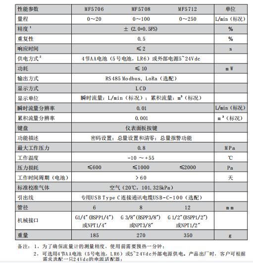 四:美國Siargo MF5700系列便攜式氣體質(zhì)量流量計(jì) 參數(shù):