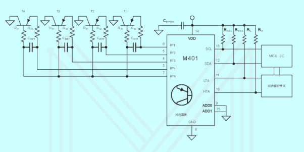 四、寬量程多路數(shù)字溫度傳感芯片-M401應(yīng)用電路: