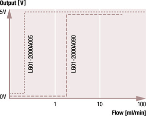 LG01系列流量開關(guān)傳感器檢測超低液體流量或流體系統(tǒng)中是否存在空氣從而使其更加可靠。可測微小流量低至毫升/分鐘甚至更小。傳感器的輸出信號0或5表明當(dāng)前流量在設(shè)定開關(guān)值以上或以下。當(dāng)流量大于設(shè)定值或氣道中有氣泡時,傳感器輸出一致。液體流量傳感器LG01基于非入侵性測量原理,可透過內(nèi)部玻璃毛細(xì)管壁實現(xiàn)對當(dāng)前流體狀況的檢測。因此,該傳感器具備卓越的生物兼容性和耐化學(xué)性。液體流量檢測器可在低于100毫秒的響應(yīng)時間內(nèi)進(jìn)行測量。