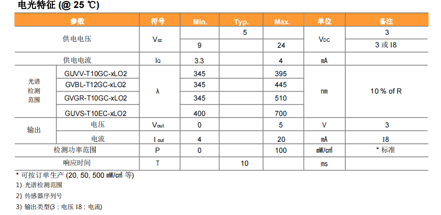 韓國(guó)GENICOM 高溫UV探頭 紫外線傳感器 UV傳感器 GUVV-T10GC-xLO2 參數(shù):