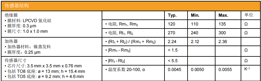 該傳感器由一個集成加熱器組成,該加熱器位于絕緣隔熱膜上。兩個薄膜電阻用于加熱和測量膜的溫度[Tm]。兩個參考電阻集成在膜旁邊的硅片上,以補償環(huán)境溫度變化。這四個電阻經過鈍化,以防止受到氣體的影響,并通過金絲鍵合與TO8或TO5底座進行電氣連接。