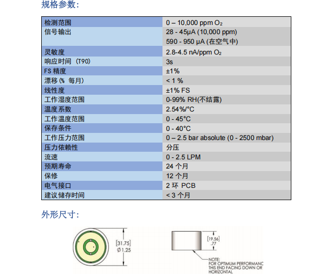 美國AII PPM O2 氧氣傳感器 微量氧傳感器?GPR-12-333-H 參數(shù):