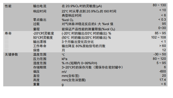 英國Alphasense O2 長壽命無鉛氧氣傳感器?LFO2-A1 參數(shù):