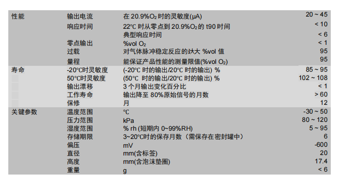 英國Alphasense O2 長壽命無鉛氧氣傳感器 LFO2-AL 參數(shù):