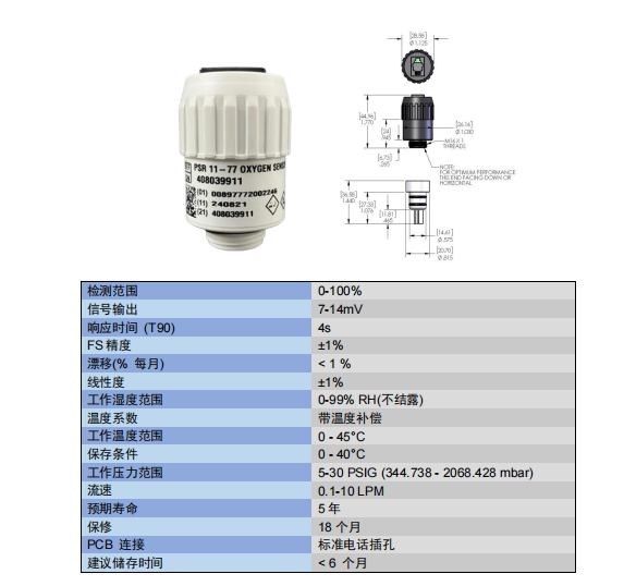 美國AII O2 氧氣傳感器 PSR-11-77 參數(shù):