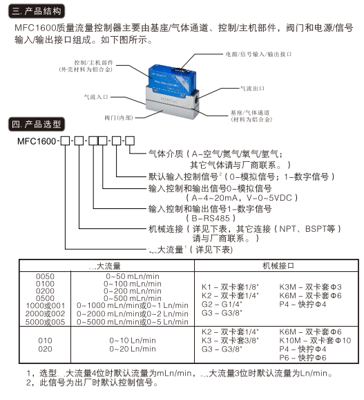 本產(chǎn)品說明書提供了MFC1600系列氣體質(zhì)量流量控制器的基本信息,可用于非腐蝕性氣體流量控制,涵蓋質(zhì)量流量50mLn/min~20Ln/min,可提供0~5VDC或4~20mA模擬信號控制,或RS485Modbus數(shù)字信號控制。本產(chǎn)品說明書包含性能指標(biāo)、機(jī)械尺寸、安裝及保修、客戶服務(wù)及訂貨等信息。MFC1600質(zhì)量流量控制器的控制范圍可達(dá)100:1,可工作在0.1~0.8MPa,0~55℃,機(jī)械接口可選雙卡套、G螺紋或快擰接頭,并可定制其他機(jī)械接口。