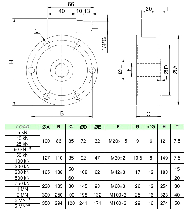 測量范圍:5kN, 10kN, 25kN, 50kN, 100kN, 200kN, 300kN, 500kN, 750kN, 1MN, 2MN, 3MN, 5MN